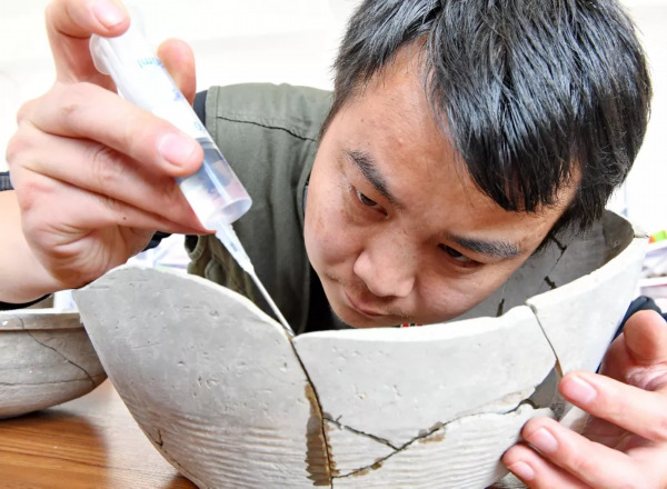2018年4月26日,考古工作者王刚在修复容城县晾马台镇南阳村遗址出土的文物。新华社记者 牟宇 摄