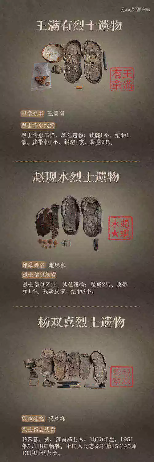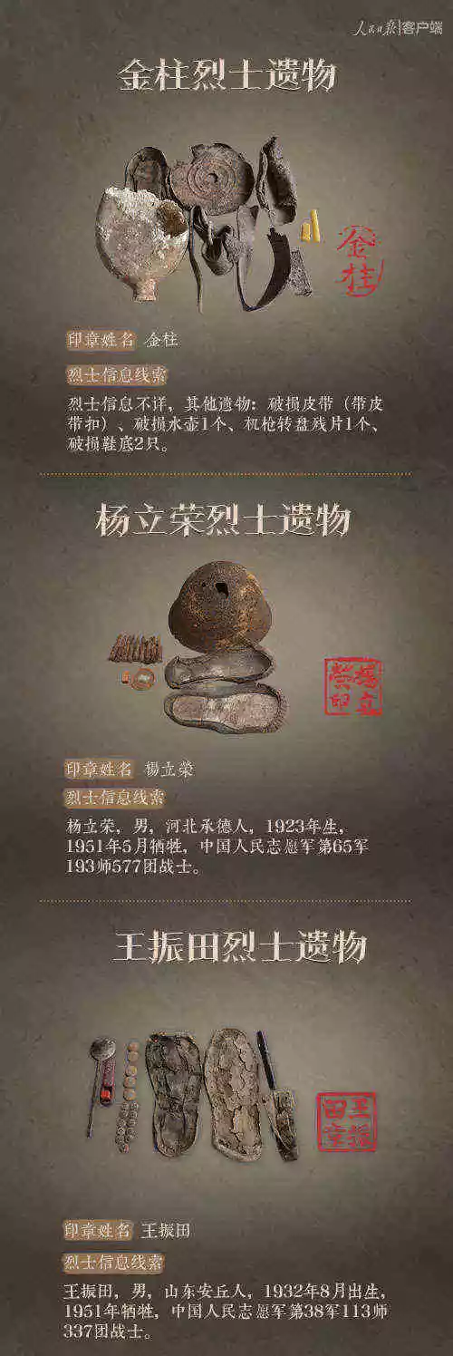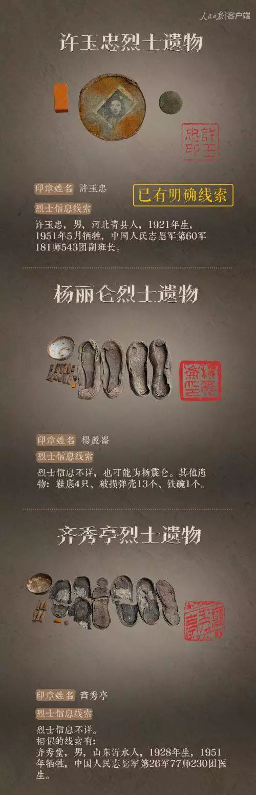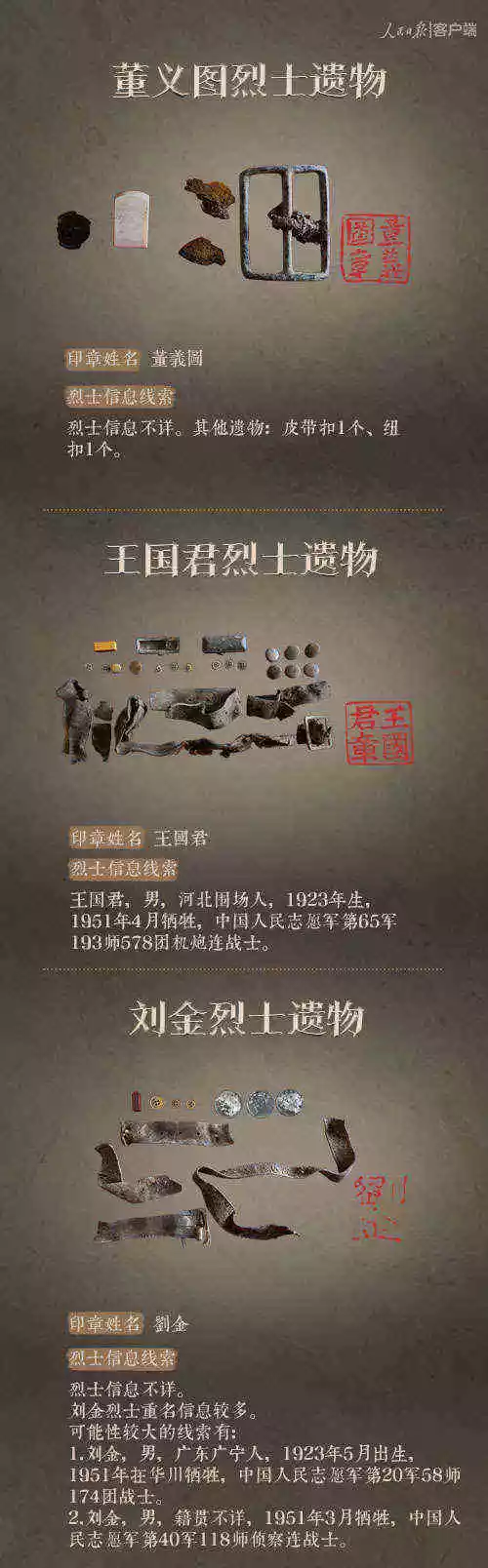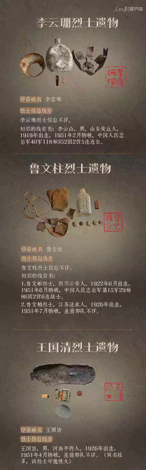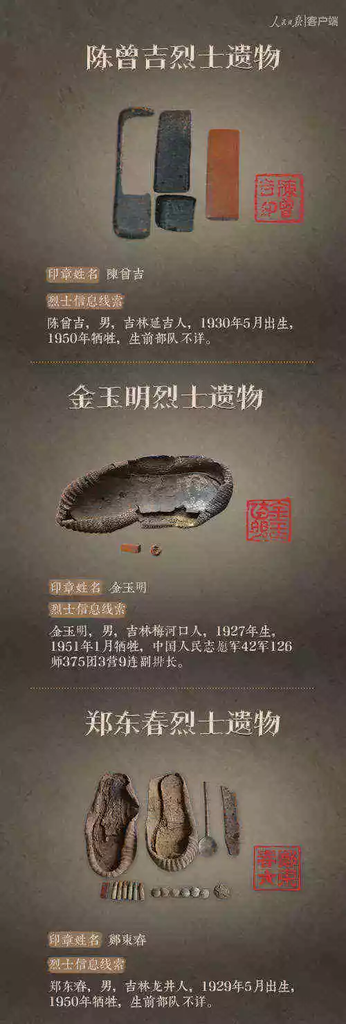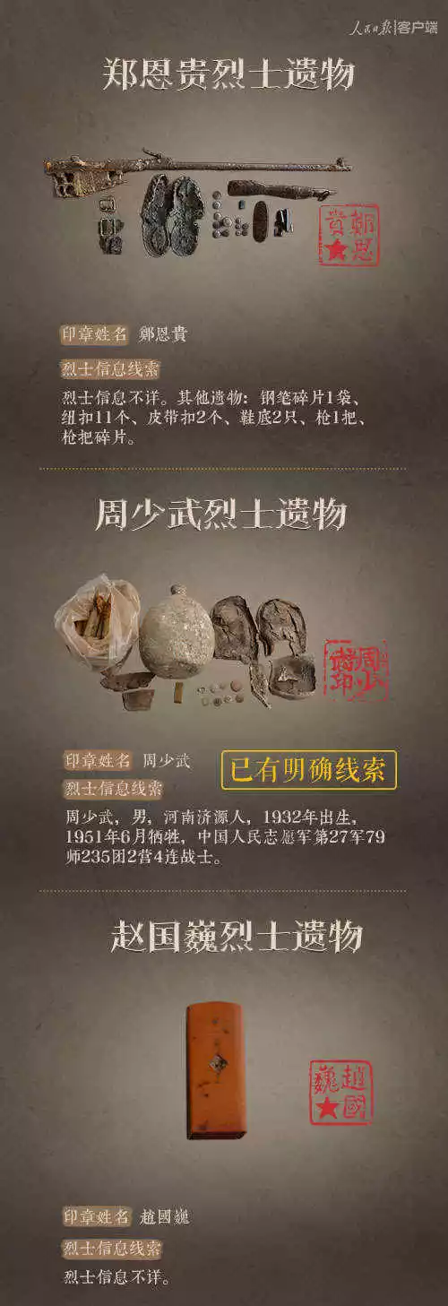 2014年以来,先后有五批589位在韩志愿军烈士遗骸回到祖国怀抱。退役军人事务部从这些烈士的上千件遗物中,发现了姓名文字图案清晰可见的24枚印章。近日与人民日报新媒体等共同发起#寻找英雄#媒体行动,向全社会征集这24位烈士亲属线索。3月29日,人民日报客户端、法人微博、微信公号同时发布稿件《当年,他们为我们牺牲;今天,请为他们做一件事》,向社会介绍“寻找英雄”活动,并公布24位烈士的基本情况和遗物信息。