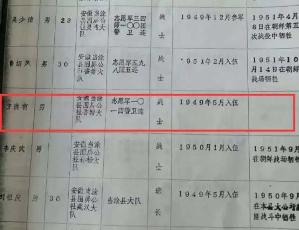 安徽马鞍山也找到了烈士方鸿有(方洪有)的亲属线索。