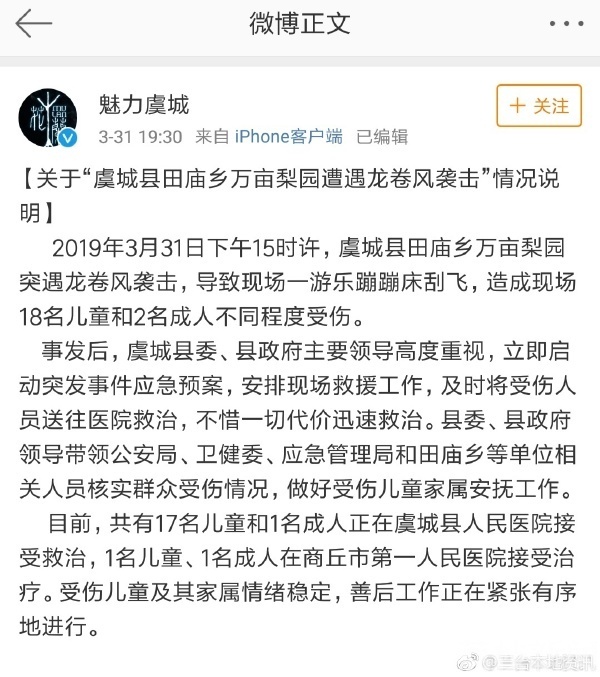 网传3月31号下午三点钟左右,河南虞城县田庙乡万亩梨园遭遇“龙卷风”袭击,导致现场一处游乐蹦蹦床被刮飞。据当地官方通报称,截至当天23点,已经造成2名儿童死亡,20名儿童和成年人不同程度的受伤。