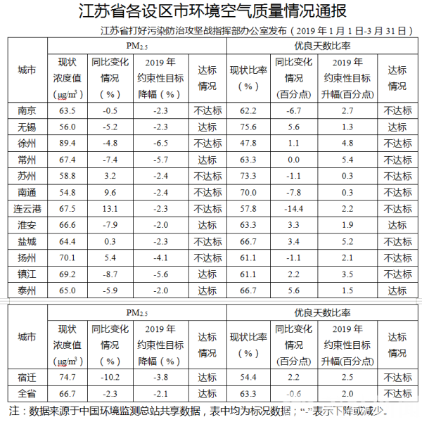 结果显示,2019年1月1日到3月31日,对照2019年各设区市环境空气质量改善约束性目标,13个设区市中,无锡、常州、淮安、镇江、泰州和宿迁6市PM2.5浓度降幅达标,其他7市PM2.5浓度降幅未达标;无锡、淮安和泰州3市优良天数比率升幅达标,其他10市优良天数比率升幅未达标。