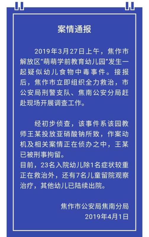 新京报讯 河南焦作一老师投毒亚硝酸钠,致一幼儿园内23人中毒。昨日晚(4月1日),焦作市公安局焦南分局就此事发布情况通报,称该事件系该园教师王某投放亚硝酸钠所致,王某已被刑事拘留。目前,23名入院幼儿除1名症状较重正在救治外,还有7名儿童留院观察治疗。
