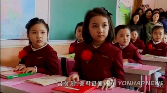 朝鲜金星第一中学,有家长拿出摄影机,录下子女的开学第一课。(朝鲜中央电视台)