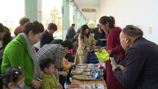 童话、演义、科幻……,各式各样的图书,两到八元不等,引得孩子们驻足围观。中班张梓恒小朋友在母亲的带领下,来到各个摊位前,用嬉乐币选购心仪的书籍。嬉乐币是校方用于奖励,在日常的志愿服务、公益活动中,表现突出的学生。
