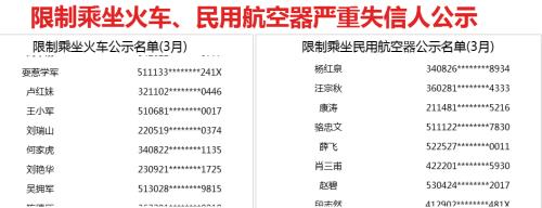 中新网客户端北京4月3日电(记者 李金磊)4月3日,国家公共信用信息中心公布3月份新增失信联合惩戒对象公示及公告情况说明,3月新增限制乘坐火车严重失信人533人,限制乘坐民用航空器严重失信人692人。