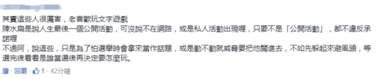 也有网友揭穿陈水扁根本是在“玩文字游戏”,“人生最后一个公开活动”可没说包括不在网络或私人活动出现,只要不是“公开活动”,都不违反“承诺”↓