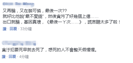 还有网友根本不买账讽刺,准备回中监了吗?没有就别说屁话!知道要被关回去,赶紧做做样子,“最佳演技奖”应该颁给贪污扁↓