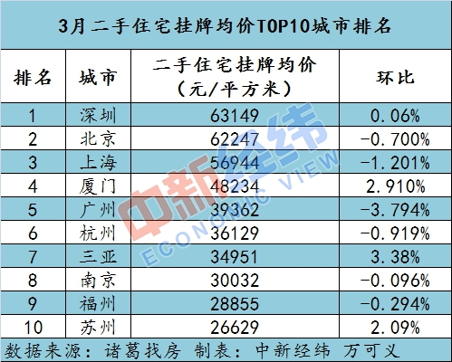 数据显示,从100个重点城市二手住宅挂牌均价情况来看,深圳以63149元/平方米占据榜首;其次为北京,挂牌均价62247元/平方米;挂牌价第三为上海,3月挂牌价为56944元/平方米;广州以39362元/平方米位列第五。