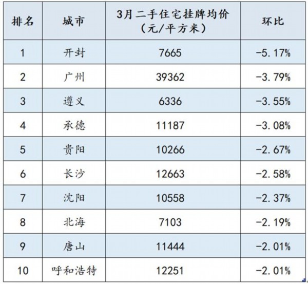 一线城市挂牌均价继续下跌,中部地区城市价格上涨