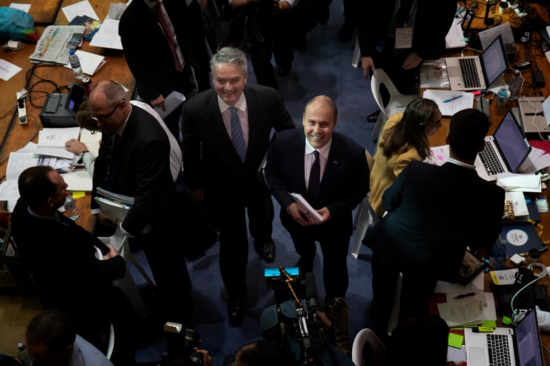 澳大利亚国库部长弗里登伯格(右)和财长马蒂亚斯 科尔曼向议会提交预算案(图源:英国《卫报》)