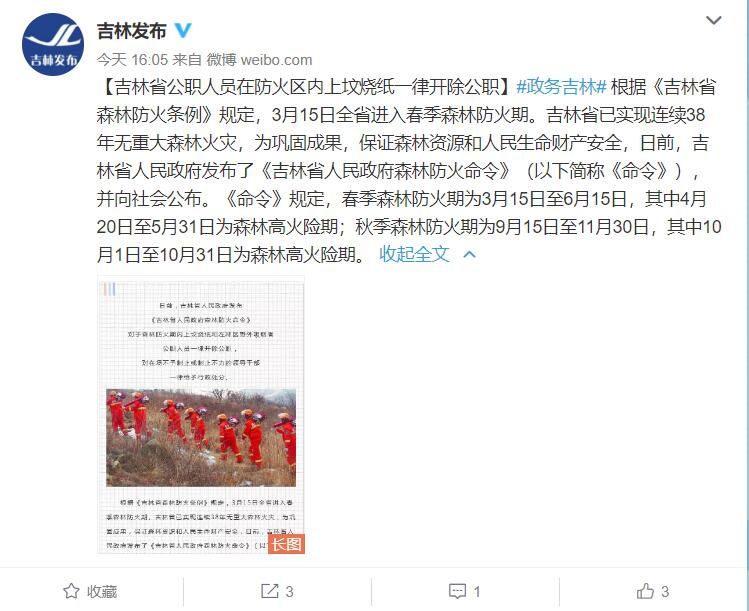 荔枝新闻讯 据吉林发布消息,近日,吉林省人民政府发布《吉林省人民政府森林防火命令》,对于森林防火期内上坟烧纸和在林区野外吸烟者公职人员一律开除公职,对在场不予制止或制止不力的领导干部一律给予行政处分。