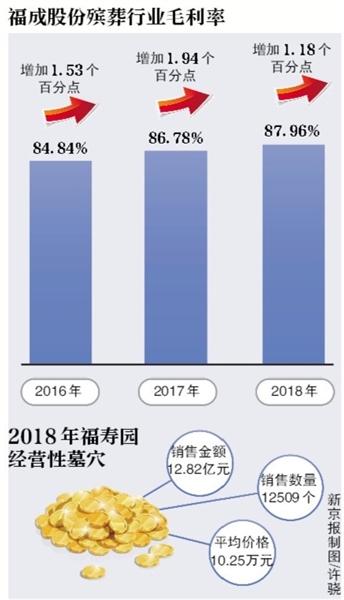 今年3月30日,福成股份发布2018年报显示,公司殡葬服务业实现营业收入2.60亿元,与上年同期相比增长14.70%。殡葬业收入增长主要是销售价格同比增长所导致,而随着殡葬业营业收入增加,成本也小幅增长了4.54%。