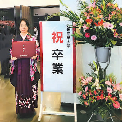 曲铭硕于3月18日在日本九州产业大学毕业典礼上。