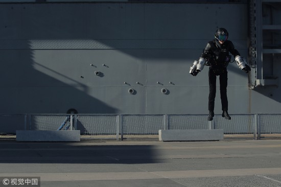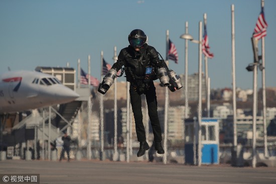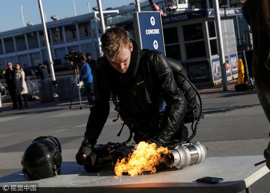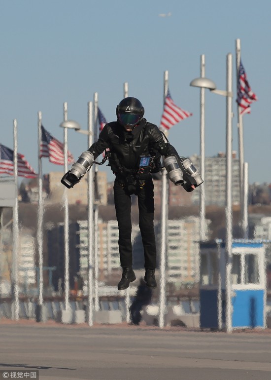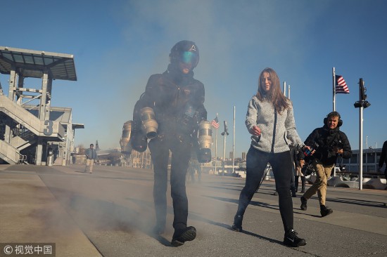 当地时间2019年4月3日,美国纽约,工程师Sam Rogers展示一套喷气式飞行服。