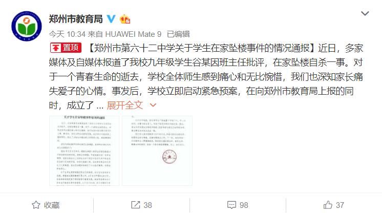 荔枝新闻讯 4月4日,郑州市教育局官方微博发布了郑州市第六十二中学关于学生在家坠楼事件的情况通报。