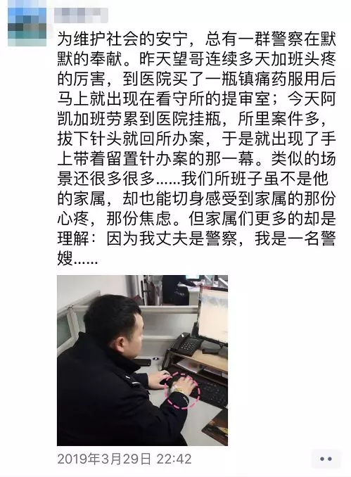 3月29日晚,安文派出所所长顾剑飞心疼地发了一条朋友圈:“总有一群警察在默默的奉献……类似的场景还有很多很多……”第二天,顾剑飞就亲自将陈宏凯“押”回了医院,让他安心接受治疗。
