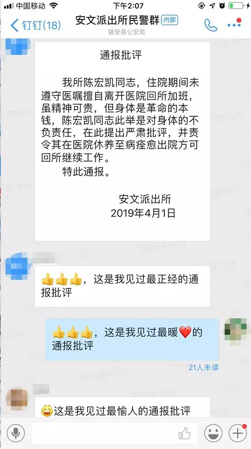 “通报批评:我所陈宏凯同志,住院期间未遵循医嘱擅自离开医院回所加班,虽精神可嘉,但身体是革命的本钱,陈宏凯同志此举是对身体的不负责任,在此提出严肃批评,并责令其在医院休养至病愈出院方可回所继续工作……”