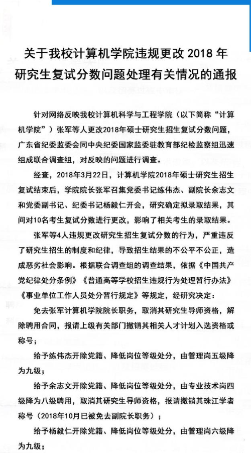 网民反映华南理工大学计算机科学与工程学院张军等人更改2018年该院硕士研究生复试分数后,教育部高度重视,立即责成学校迅速查清事实,严肃追责问责,并派员实地督办。根据调查结果,华南理工大学已对张军等四名直接涉事人员和学校招生部门负责人做出严肃处理并向社会进行了通报。