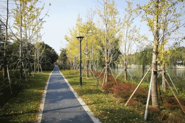 慢行步道位于桐泾南路东侧、胥江南侧绿化地。