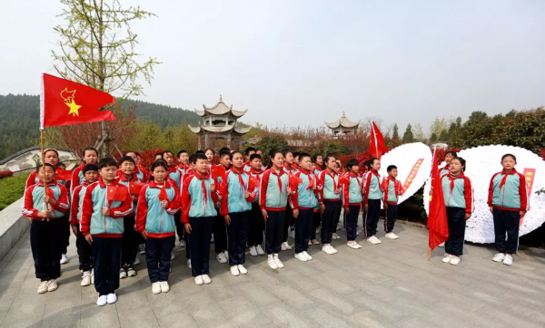 少先队员出旗、唱队歌。随后,全体人员缓步而行,瞻仰烈士纪念碑。