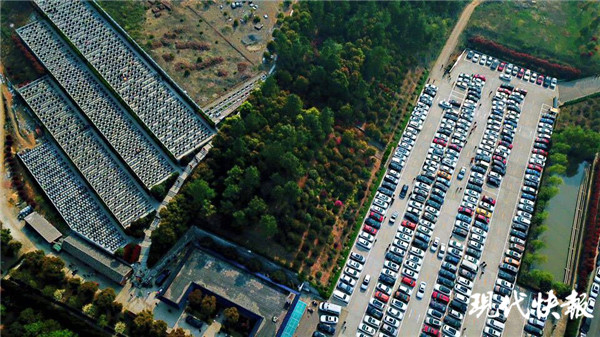 上午9点半,花神大道上车辆川流不息。靠雨花功德园的这一侧,沿街都停满了车。还有不少车辆为了进入墓园内的停车场,在进园的道路上缓慢地挪动着。