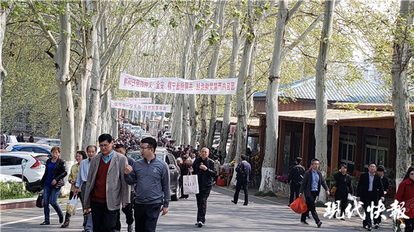 在进入墓园的路上,沿路两边都是摆卖祭扫品的摊点,各式各样的花占据绝对醒目的位置,不仅有成束的菊花,还有绣球花、铃兰等盆栽鲜花,绳子上还悬挂着一条条绢花。绝大多数的祭扫市民都怀抱鲜花,“菊花10块钱一把。”摊主的吆喝声,吸引不少人购买。家住新街口附近的李女士告诉现代快报记者,他们一家选择了地铁出行,“8点半出发,9点钟就到了,还不要找停车场。”