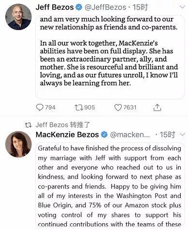 贝索斯转发了麦肯齐的推文,同时也对朋友和家人表达了感激之情,还特别感谢及盛赞了前妻麦肯齐。