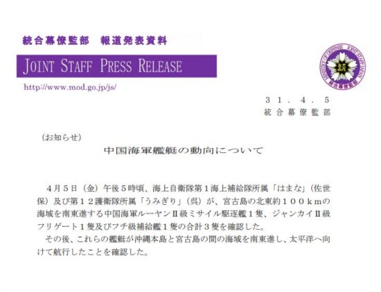 统合幕僚监部资料称,4月5日下午5时许,日本海上自卫队两舰船在宫古岛北偏东约100公里处海域发现正在向东南方向航行的中国海军3艘军舰。随后,经日本海自舰船跟踪监视确认,3艘中国海军军舰穿越冲绳本岛与宫古岛之间的宫古海峡继续向东南前进,进入太平洋海域航向。