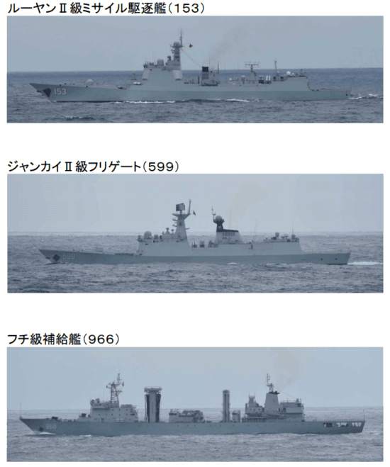 资料显示,日本海自经识别查证后确认,3艘中国军舰分别为西安号导弹驱逐舰(舷号153)、安阳号护卫舰(舷号599)及高邮湖号补给舰(舷号966)。
