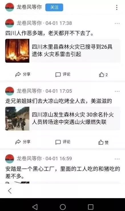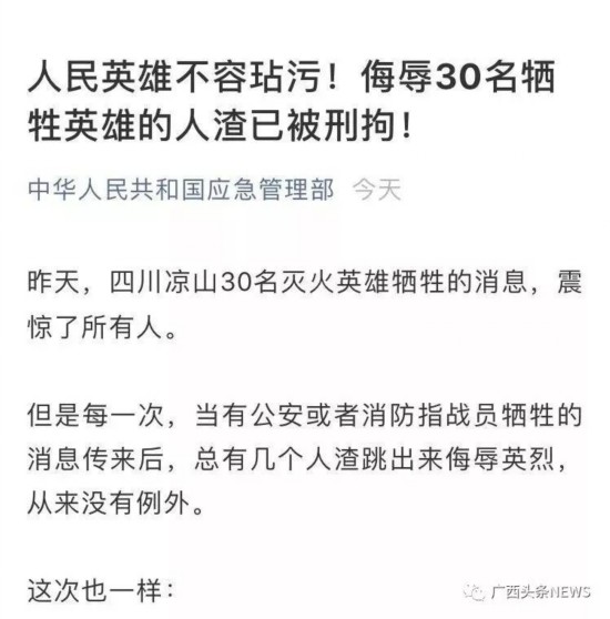 4月2日,针对有网民网上公然侮辱四川凉山30名灭火牺牲的英雄、引发全体网友愤怒一事,国家应急管理部官方微信公众号发文称:当有公安或者消防指战员牺牲的消息传来后,总有几个人渣跳出来侮辱英烈,从来没有例外。