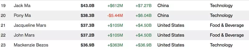 根据彭博社4月7日发布的“彭博亿万富翁指数”,麦肯齐即使放弃了一大笔财富,也成功跻身全球女性富豪榜,名列第4,在全球富豪榜上排名第23。(马云排名19,马化腾排名20)