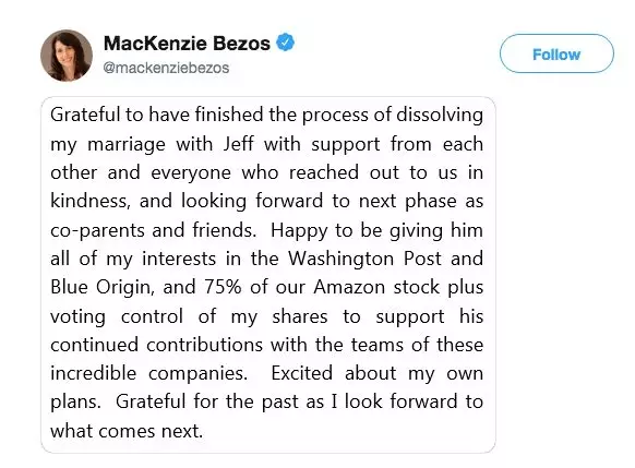 3个月过去了,这个天价离婚案终于划上了句号。贝索斯前妻麦肯齐·贝索斯4日在推特上公开表示,她和贝索斯达成了离婚协议。在两人的共同财产中,麦肯齐放弃《华盛顿邮报》和太空探索公司蓝色起源(Blue Origin)的全部股权,只保留两人共同持有的亚马逊股份的25%,并将所有股权的投票权也授予贝索斯,以支持他继续领导这些公司。