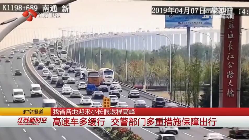 由于今年清明小长假天气晴好,出行人数较多,全省各地高速公路今天一早就迎来返程高峰。其中,江阴大桥、苏通大桥车多缓行情况最为明显,江阴大桥每小时车流量在4500辆左右,苏通大桥今天预计车流量将突破13万辆。