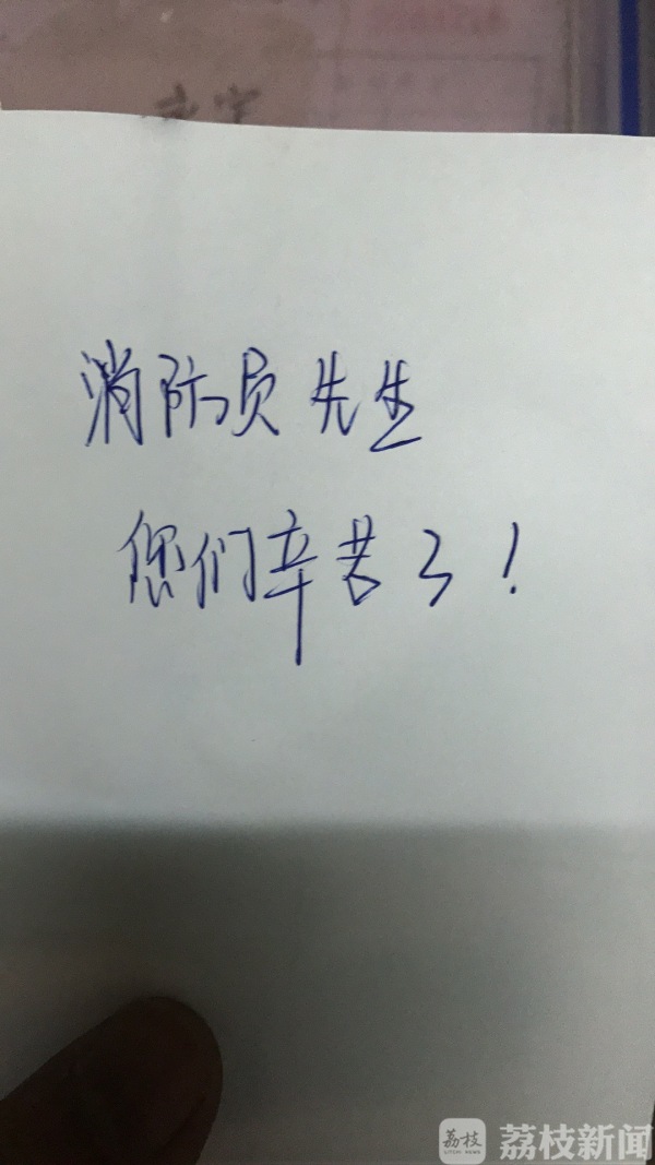 4月7日上午,在桑植消防中队,一名男子跟随消防执法车辆匆匆跑进营区将三袋牛奶、饮料和食品放在地上,还没等岗哨问话就匆匆转身跑了。留下一张匿名纸条上写着“你们辛苦了,你们每次执行任务注意安全一定要平安归来。”