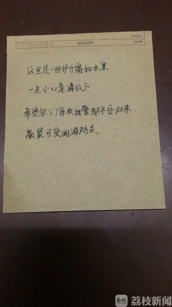 4月6日晚上,永定中队的监控拍摄到这样一幕,一名女子提了两盒水果和两瓶护手霜偷偷放在岗哨门口转身离开了,待消防员出来寻找的时候人已经跑不见了,只看到留下的一张匿名纸条写着,“这里是一些护手霜和水果,一点小心意请收下,希望你们每次出警都平安归来,敬最可爱的消防员。”