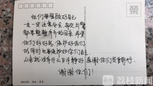 明信片上写着“你们要照顾好自己,一定一定注意安全,每次出警都要整整齐齐回来,希望你们好好的,保护好我们的同时也要保护好你们自己,从来就没有什么岁月静好,感谢你们负重前行,谢谢你们!”
