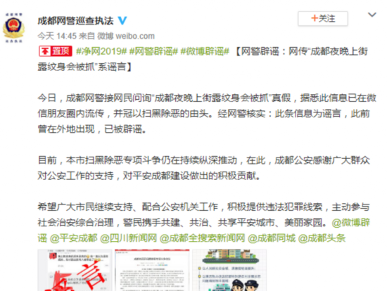 据成都市公安局网络安全保卫支队4月8日消息,今日成都网警接网民问询“成都夜晚上街露纹身会被抓”真假,据悉此信息已在微信朋友圈内流传,并冠以扫黑除恶的由头。经网警核实:此条信息为谣言,此前曾在外地出现,已被辟谣。