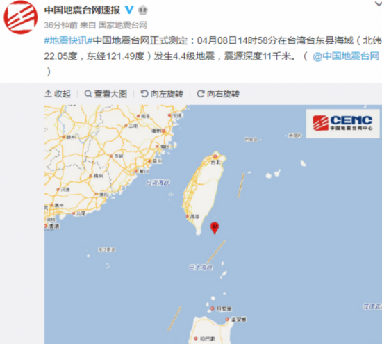 中国地震台网4月8日发布地震正式测定信息:台湾台东县海域(北纬22.05度,东经121.49度)4月8日14时58分发生4.4级地震,震源深度11千米。