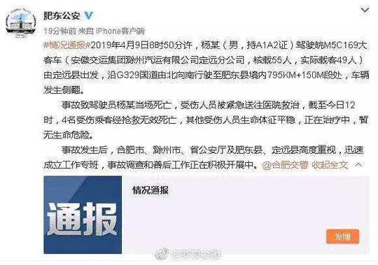 据安徽省合肥市肥东县公安局通报,4月9日8时50分许,杨某(男,持A1A2证)驾驶皖M5C169大客车(安徽交运集团滁州汽运有限公司定远分公司,核载55人,实际载客49人)由定远县出发,沿G329国道由北向南行驶至肥东县境内795KM+150M段处,车辆发生侧翻。