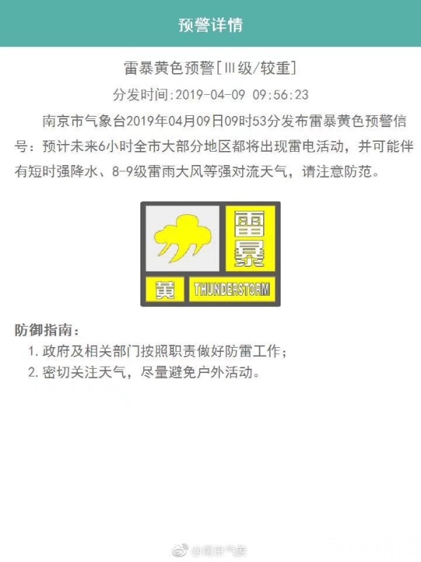 一早感叹穿多的朋友,现在是不是在庆幸自己的英明?这不,一大波强对流天气冲着南京来了!南京市气象台于4月9日9时53分发布雷暴黄色预警信号,预计未来 6 小时全市大部分地区都将出现雷电活动,并可能伴有短时强降水、8-9 级雷雨大风等强对流天气,请注意防范。