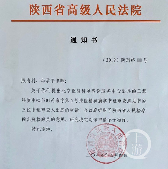 由邓学平提供的一份陕西省高院4月4日出具的《通知书》显示:“……合议庭听取了陕西省人民检察院出庭检察员的意见,研究决定对该申请不予准许。”