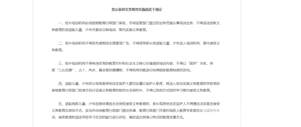 《规定》要求,校外培训机构不得违法招收义务教育阶段适龄儿童、少年开展全日制培训,替代实施义务教育;不得发布虚假招生简章或广告,诱导家长将适龄儿童、少年送入培训机构,替代接受义务教育;不得有违反党的教育方针和社会主义核心价值观的培训内容,不得以“国学”为名,传授“三从四德”、占卜、风水、算命等封建糟粕,不得利用宗教进行妨碍国家教育制度的活动。