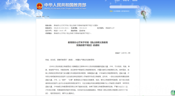 为切实保障国家义务教育制度实施,纠正严重影响适龄儿童、少年成长发展的违法违规行为,教育部办公厅日前印发《禁止妨碍义务教育实施的若干规定》(简称《规定》),要求各地教育部门提高政治站位,增强法治意识,进一步加强适龄儿童、少年接受义务教育工作。于2019年上半年尽快部署开展一次全面排查,对机构或个人违法违规导致适龄儿童、少年未接受义务教育的行为,坚决予以纠正,依法依规严厉查处问责,切实保障适龄儿童、少年接受义务教育。