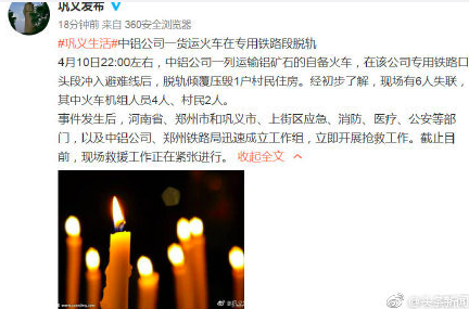 荔枝新闻讯 4月10日22:00左右,中铝公司一列运输铝矿石的自备火车,在该公司专用铁路口头段冲入避难线后,脱轨倾覆压毁1户村民住房。经初步了解,现场有6人失联,其中火车机组人员4人、村民2人。