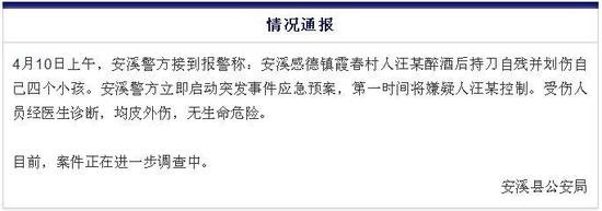4月10日上午,安溪警方接到报警称:安溪感德镇霞春村人汪某醉酒后持刀自残并划伤自己四个小孩。安溪警方立即启动突发事件应急预案,第一时间将嫌疑人汪某控制。受伤人员经医生诊断,均皮外伤,无生命危险。