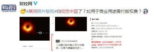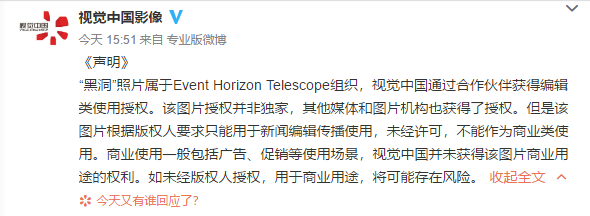 下午,@视觉中国影像 官方微博对黑洞“证件照”的版权进行了说明,称“照片属于Event Horizon Telescope组织,视觉中国通过合作伙伴获得编辑类使用授权,该图片授权并非独家。”