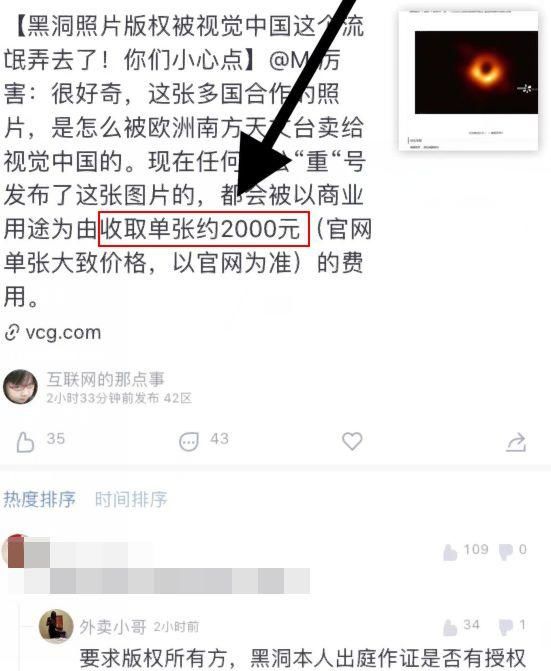 荔枝新闻讯(记者/李照、周诗婕)10日晚上,全球首张黑洞“证件照”正式亮相,11日一早,“黑洞照片版权归视觉中国”消息迅速刷屏,网友发现,黑洞照片若被用于商业用途,会被收取单张2000元的费用(官网单张大致价格,以官网为准)。