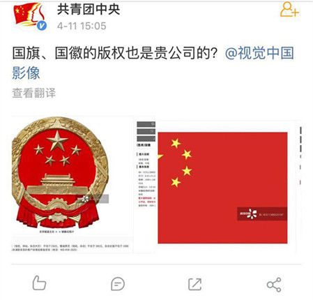 随后,@共青团中央 官方微博发现国旗国徽版权也在视觉中国网站之中,引起舆论热议。