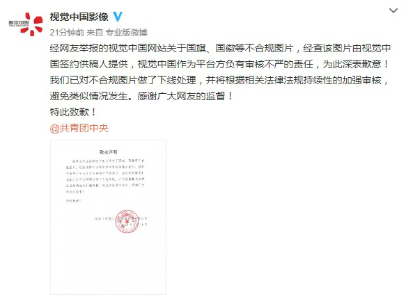 11日晚,记者发现视觉中国网站已经无法打开。@视觉中国影像 官方微博发布道歉声明,称网友举报的视觉中国网站关于国旗、国徽等不合规图片系签约供稿人提供,视觉中国作为平台方负有审核不严的责任,对此深表歉意,并做出下线处理。
