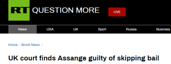 RT报道称,由于违反原保释条款,维基解密创始人将面临12个月的监禁,他将于5月2日被审判。
